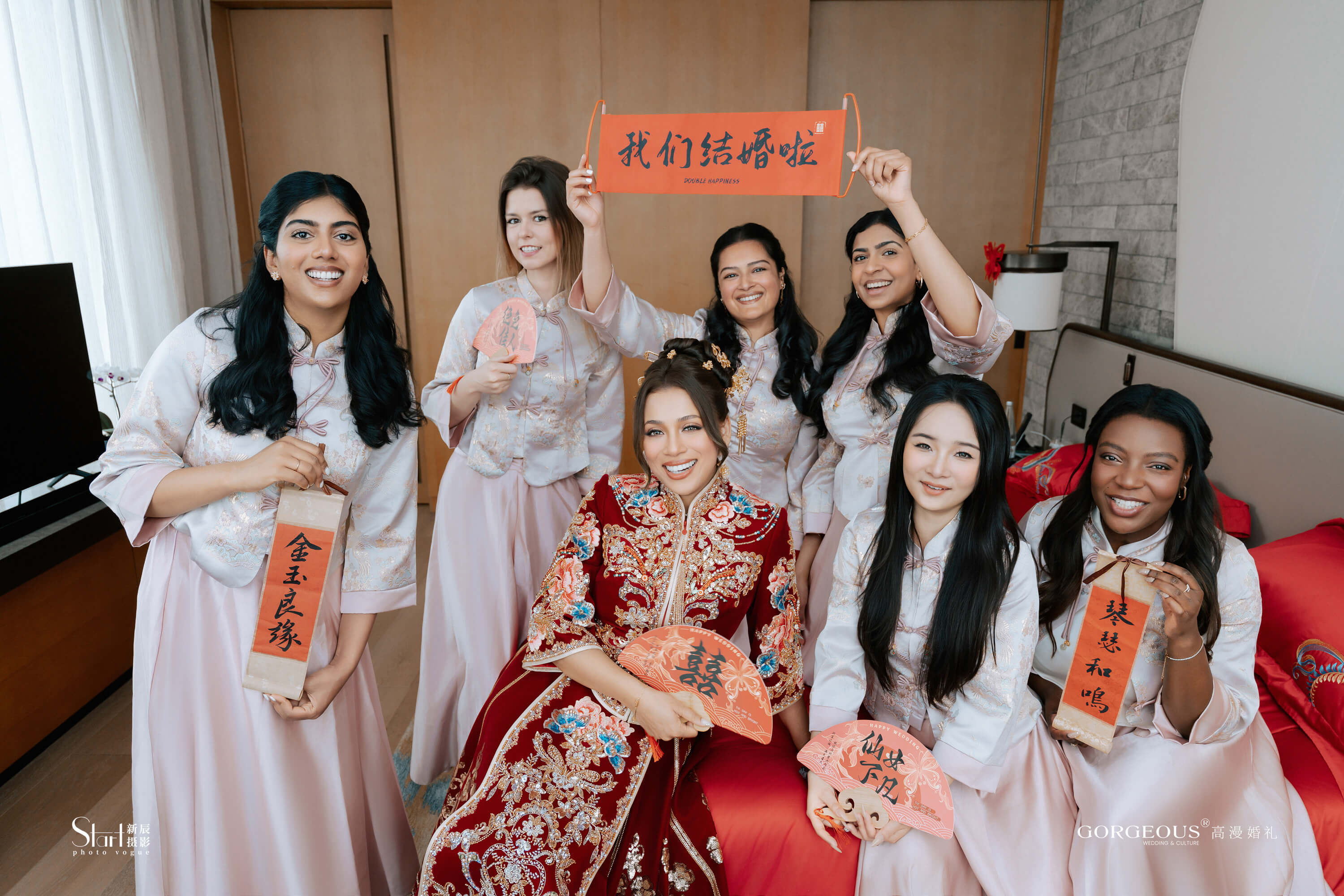 The bridesmaids from Bangladesh wore Chinese-style dresses to offer their blessings for this wedding.