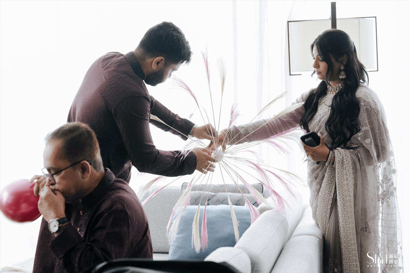 The wedding room for the groom's procession was initially empty and undecorated, but was finally completed with everyone's help.