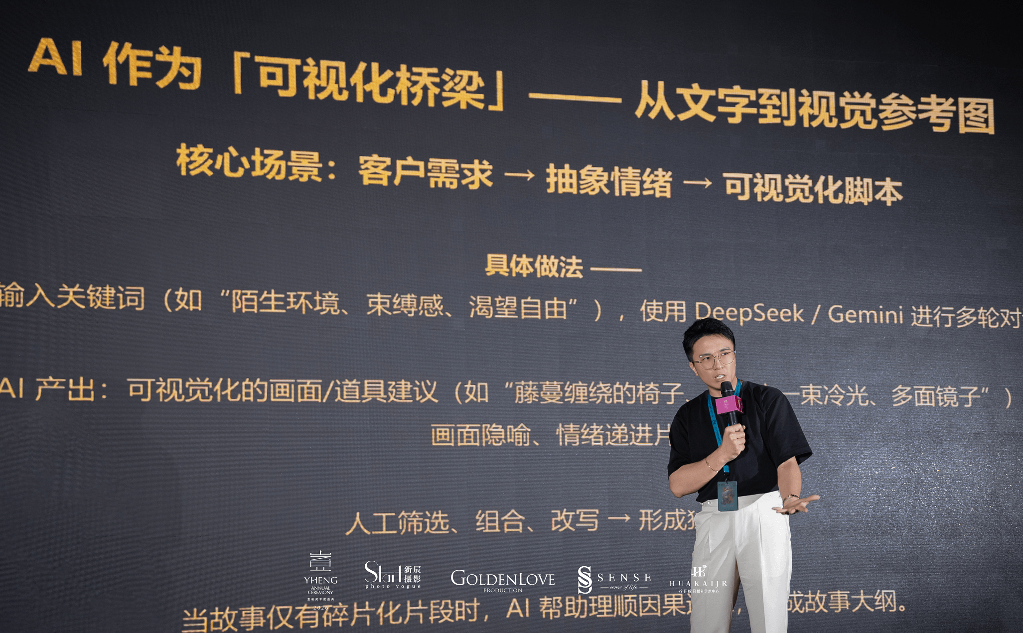 作为特邀影像品牌,GoldenLove创始人EssieChang登上演讲台,以《GOLDENLOVE 深度AI创作流程·我们是如何做到最早、最好、最领先》为题,向全行业系统分享了GoldenLove在AI与婚礼影像融合领域的十年探索。